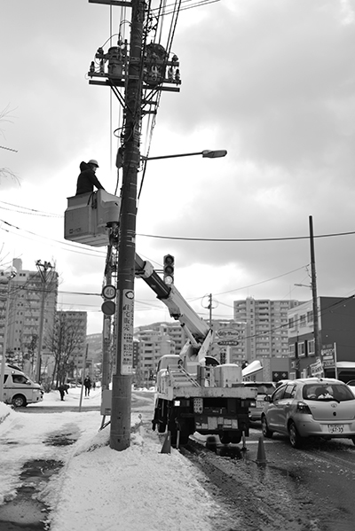 | この写真は、近所を散歩中に写しました。 私たちはこのような生活を支えてくれる人がいて始めて、快適な生活を送れるということを実感させられます。そんな想いをこめて撮影してみました。 カラーにすると情報過多になるので、モノクロに敢えてしています |